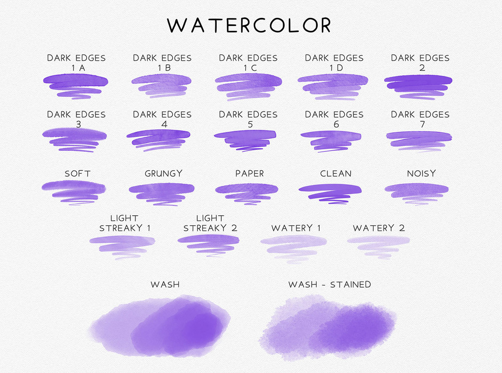 This pack includes 16 brush pen and pointed pen brushes, 17 vibrant marker brushes, 25 detailed blackletter brushes, 12 authentic chalk brushes, 21 fluid watercolor brushes, and 9 bonus brushes for endless creative possibilities!
